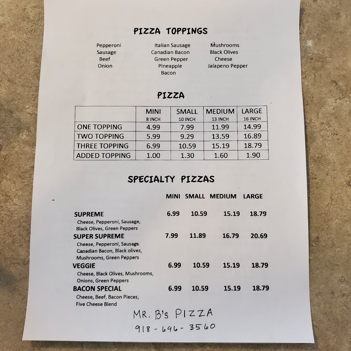 Welcome to Mr B's Pizza, a beloved culinary gem nestled in the heart of Stilwell, Oklahoma. Located at 300 W Locust St, this cozy eatery has become a go-to spot for pizza lovers and families alike who appreciate both quality food and friendly service. The warmth of Mr B's is mirrored in its welcoming atmosphere and dedicated staff, who consistently strive to provide an exceptional dining experience.